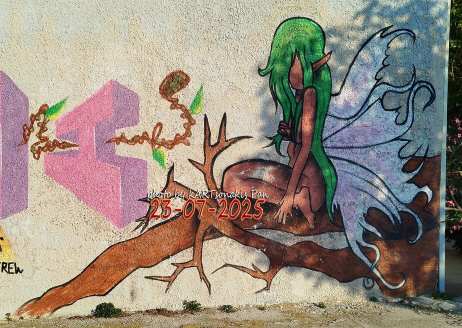 Ένα γκράφιτι με μια νεράιδα με πράσινα μαλλιά που ευτυχώς υπάρχει ακόμη κάπου στην Κόρινθο.
