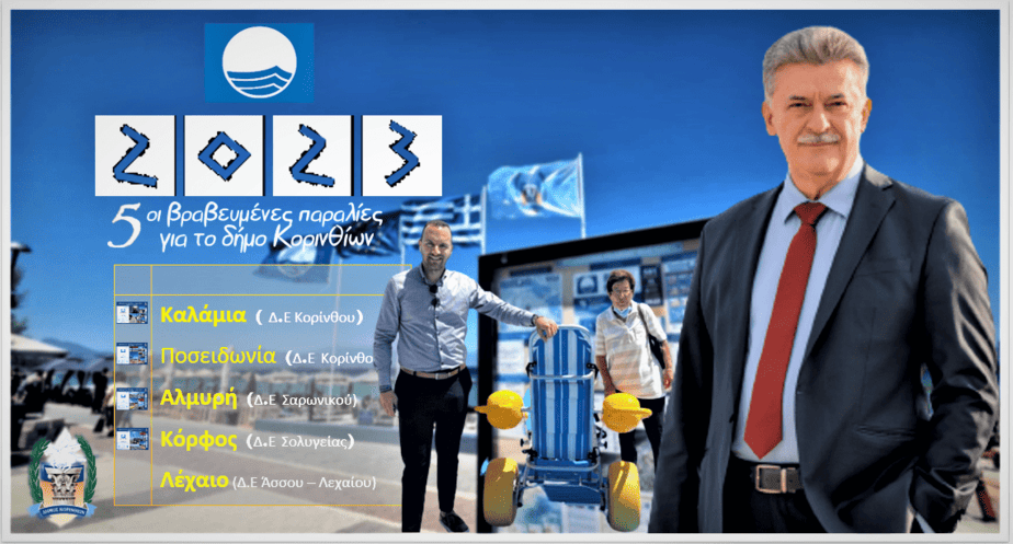 Το απόγευμα της Τετάρτης 10 Μαΐου 2023 , η Ελληνική Εταιρία Προστασίας της Φύσης (ΕΕΠΦ), Εθνικός Χειριστής του Διεθνούς Προγράμματος “Γαλάζια Σημαία” στη χώρα μας, ανακοίνωσε τις παραλίες που λαμβάνουν το διεθνές εύσημο της Γαλάζιας Σημαίας για την φετινή σεζόν. Ο Δήμος Κορινθίων αυξάνει τις πιστοποιημένες παραλίες σε πέντε εντάσσοντας και την παραλία του Λεχαίου η οποία προετοιμάστηκε για το πρόγραμμα την περασμένη περίοδο..