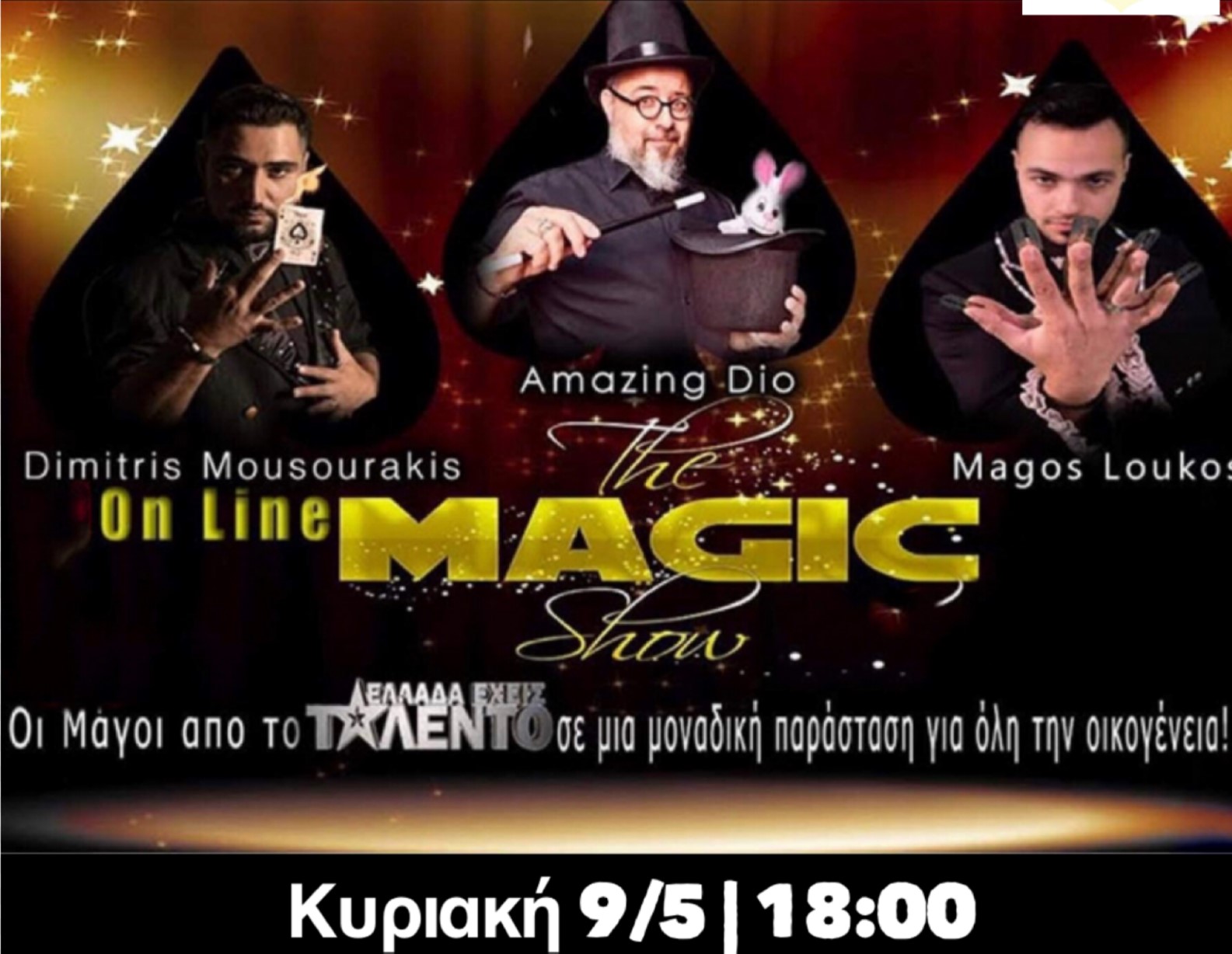 Μια παράσταση για μικρούς και μεγάλους φίλους του Δήμου Κορινθίων που θα μπορέσουν να συμμετάσχουν ζωντανά μέχρι και 500 με τους πλέον αναγνωρίσιμους μάγους στην Ελλάδα, το μάγο Λούκο, το μάγο Μουζουράκη και τον δικό μας Κορίνθιο Amazing Dio που τον γνωρίζει ολη η Ελλάδα από τη συμμετοχή του μέχρι και στον τελικό του πιο διαδεδομένου talent show. Θα λάβει χώρα αυτήν την Κυριακή στις 18.00 και όποιος θέλει θα μπορεί να συμμετάσχει μέσω της πλατφόρμας Zoom.