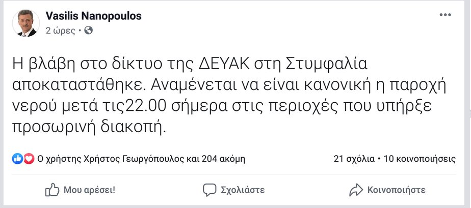 Κεντρική Σελίδαold Ανακοίνωση του δημάρχου Κορινθίων για τη βλάβη στη ΔΕΥΑΚ 29/09/2019 0 FacebookTwitterPinterestWhatsAppEmailViber Η βλάβη στο δίκτυο της ΔΕΥΑΚ στη Στυμφαλία αποκαταστάθηκε. Αναμένεται να είναι κανονική η παροχή νερού μετά τις22.00 σήμερα στις περιοχές που υπήρξε προσωρινή διακοπή. ΜΟΙΡΑΣΟΥ ΤΟ ΑΡΘΡΟ: Click to share on X (Opens in new window) X Click to share on Facebook (Opens in new window) Facebook Click to email a link to a friend (Opens in new window) Email Click to share on WhatsApp (Opens in new window) WhatsApp Click to print (Opens in new window) Print Click to share on LinkedIn (Opens in new window) LinkedIn Μεγάλη βλάβη στον αγωγό της ΔΕΥΑΚ στον Άγιο ΓεωργιοDate20/11/2025In relation toΕπικαιρότηταΑνακοίνωση της ΔΕΥΑΚ Κορίνθου για διακοπές νερουDate02/07/2020In relation toΚεντρική ΣελίδαΠρόβλημα με την ύδρευση στο ΠεριγιάλιDate18/03/2020In relation toΚεντρική Σελίδα