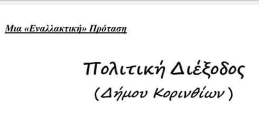 Πολίτες του Δήμου Κορινθίων παρεμβαίνουν στα Δημοτικά πράγματα με μια πρωτοβουλία που θέλουν να επηρεάσει τις εξελίξεις. Εκτιμούν ότι η υπάρχουσα κατάσταση δεν ικανοποιεί τους πολίτες και δεν σηματοδοτεί θετική προοπτική για τον τόπο. Θεωρούν ότι υπάρχει ένα αδιέξοδο στα Δημοτικά πράγματα και προτείνουν μία “Πολιτική Διέξοδο”, ανεξάρτητη όμως από κομματικές εξαρτήσεις, φανερές ή κρυφές. Με ένα περιεκτικό και ενδιαφέρον κείμενό τους δηλώνουν την παρουσία τους και ζητούν την κινητοποίηση και συνεργασία όλων των πολιτών για μία κοινή παρέμβαση και τις διεκδικήσεις τους. Το προσεχές μέλλον θα δείξει αν θα είναι μια πρόταση-έκπληξη, μάλιστα εν όψει των Δημοτικών Εκλογών του Φθινοπώρου (2023).