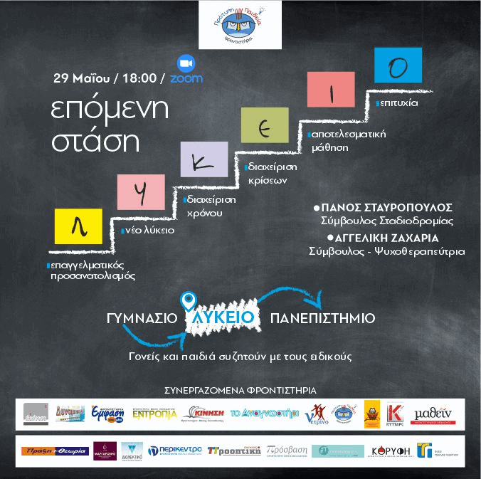 Το Σάββατο 29 Μάιου στις 6.00΄ το απόγευμα! Μια ξεχωριστή εκδήλωση επαγγελματικού προσανατολισμού και ψυχολογικής προετοιμασίας για τους μαθητές και τις μαθήτριες του Γυμνασίου –και όχι μόνο-! Συζητάμε με τον Πάνο Σταυρόπουλο, σύμβουλο σταδιοδρομίας, και την Αγγελική Ζαχαριά, σύμβουλο ψυχοθεραπεύτρια, για το Λύκειο, τις προοπτικές, την καραντίνα, τις αντοχές όλων μας! Οι εισηγητές μας είναι σπουδαίοι, η ανάγκη να μιλήσουμε μεταξύ μας όλοι και όλες (μαθητές, γονείς, εκπαιδευτικοί) είναι δεδομένη και η ποιοτική και έγκυρη πληροφόρηση είναι εξασφαλισμένη! Συν τοις άλλοις οι αλλαγές στο λύκειο είναι σημαντικές και όχι μόνο γιατί αλλάζει το σχολείο (από Γυμνάσιο σε Λύκειο), αλλά και γιατί η Τράπεζα Θεμάτων δημιουργεί νέα δεδομένα. Και ένας άλλος λόγος για τον οποίο είμαστε όλοι και όλες χαρούμενοι – και γιατί όχι- περήφανοι: 20 φροντιστήρια μαζί, από όλη την Ελλάδα, φίλοι και με τις ίδιες αγωνίες κάνουμε πάλι μαζί αυτήν την ξεχωριστή εκδήλωση και θα συνεχίσουμε!