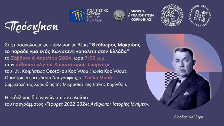 Στο πλαίσιο του προγράμματος «Γέφυρες 2022-2024: Άνθρωποι-Ιστορίες-Μνήμες», το Ιστορικό Λαογραφικό Μουσείο Κορίνθου (Ι.Λ.Μ.Κ.), το Πολιτιστικό Ίδρυμα Ομίλου Πειραιώς (ΠΙΟΠ) και η Εφορεία Αρχαιοτήτων Κορινθίας (ΕΦ.Α.ΚΟΡ.) οργανώνουν, σε συνεργασία με τη Μικρασιατική Στέγη Κορίνθου, εκδήλωση αφιερωμένη στον Κωνσταντινοπολίτη Αρχαιολόγο Θεόδωρο Μακρίδη, το Σάββατο 6 Απριλίου 2024 (ώρα 19:00), στην αίθουσα «Αγίου Χρυσοστόμου Σμύρνης» του Ι.Ν. Κοιμήσεως Θεοτόκου Κορίνθου (Ιωνία Κορίνθου).