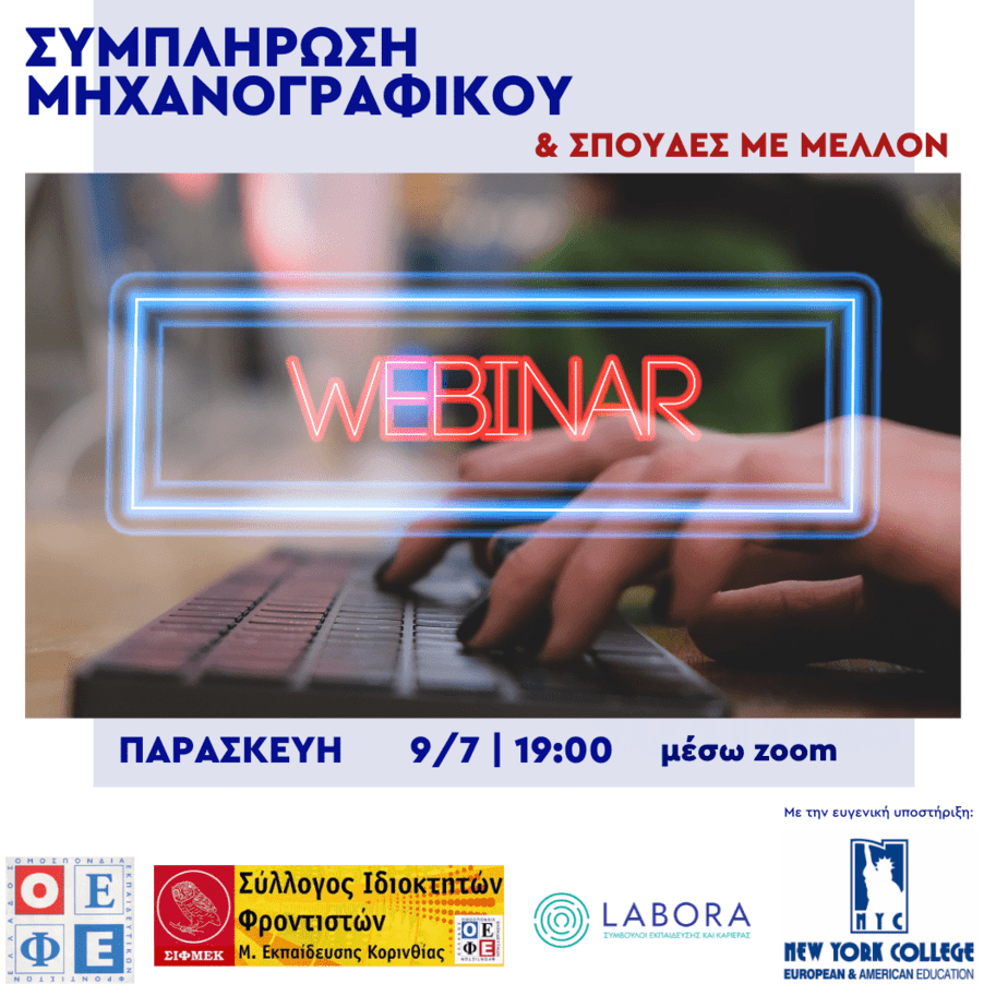 O Σύλλογος Εκπαιδευτικών Φροντιστών Μ. Εκπαίδευσης Κορινθίας (ΣΙΦΜΕΚ) στα πλαίσια της έγκαιρης και έγκυρης ενημέρωσης των μαθητών και των γονέων διοργανώνει WEBINAR επαγγελματικού προσανατολισμού με τίτλο: ΣΠΟΥΔΕΣ ΜΕ ΜΕΛΛΟΝ & ΟΡΘΗ ΣΥΜΠΛΗΡΩΣΗ ΜΗΧΑΝΟΓΡΑΦΙΚΟΥ σε συνεργασία με την επιστημονική ομάδα της LABORA Σύμβουλοι Εκπαίδευσης (www.labora.gr) και ομιλητή τον Δρ. Κότιο Κωνσταντίνο, Σύμβουλο Εκπαίδευσης και Καριέρας και ιδρυτή της.