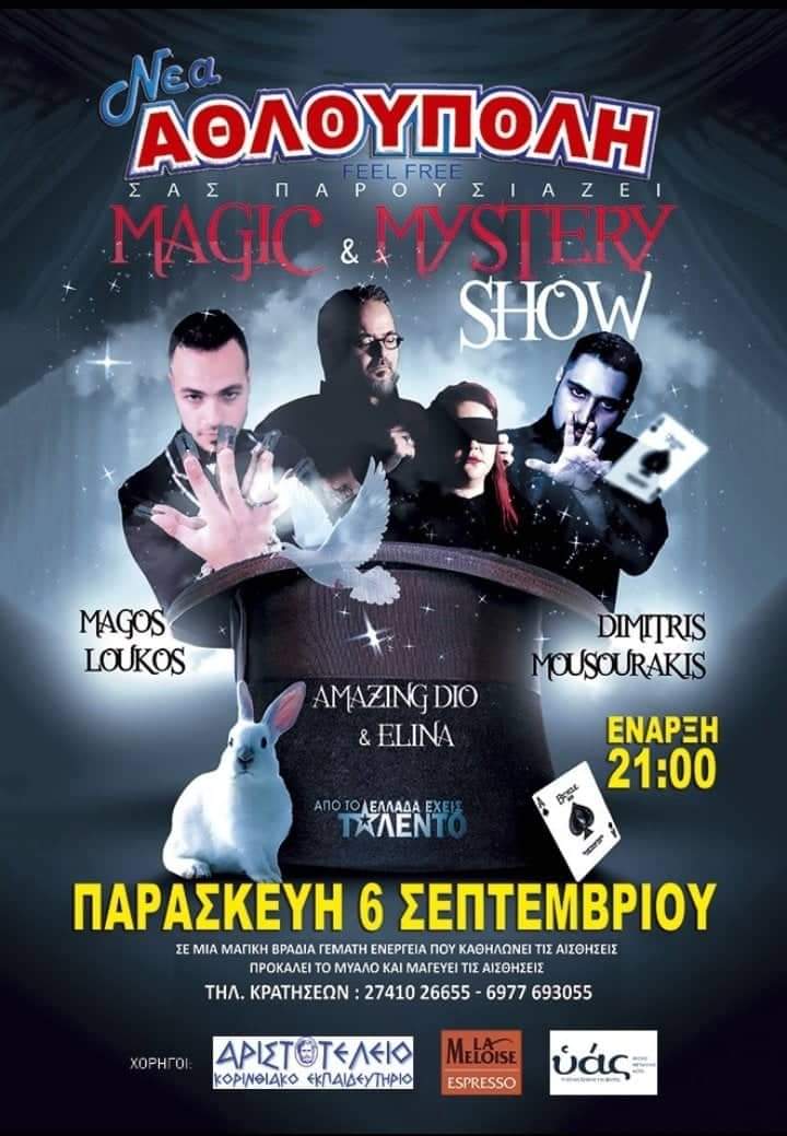Ένα μοναδικό «Magic and Mystery Show» για μικρούς και μεγάλους, από 3 διάσημους Έλληνες Μάγους που διέπρεψαν στην εκπομπή “Ελλάδα Εχεις Ταλεντο” , τον απίστευτο Μάγο Λούκο , τον εκπληκτικό Μάγο Μουσουράκη και βέβαια τον δικό μας Amazing Dio με την Elina , το τηλεπαθητικό ζευγάρι του «Ελλάδα Εχεις Ταλέντο» που έφτασε 2 φορές στους ημιτελικούς, σε μια παράσταση που θα κάνει τα αδύνατα να φαίνονται δυνατά, μόνο στην ΑΘΛΟΥΠΟΛΗ.