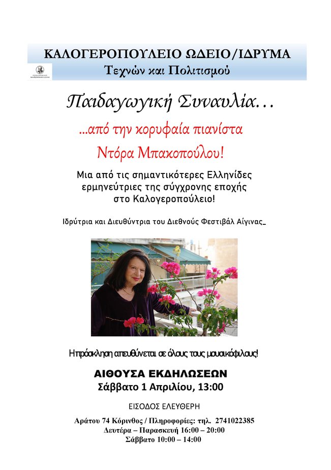 Το Σάββατο 1 Απριλίου 2023 καλωσορίζουμε την ΄Ανοιξη με την σημαντική παιδαγωγική συναυλία της διάσημης Ελληνίδας πιανίστα Ντόρας Μπακοπούλου ! Θα παρουσιάσει έργα Chopin και θα μιλήσει για την Τέχνη του Μουσικού και την Μουσική. Η είσοδος είναι ελεύθερη. Σας περιμένουμε.
