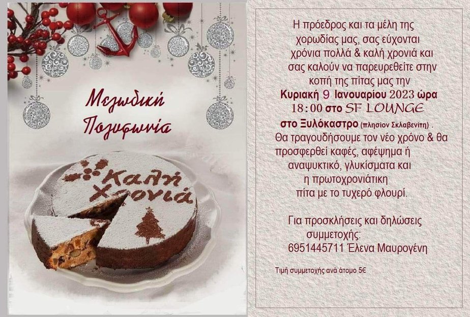 Η πρόεδρος και τα μέλη της χορωδίας μας, σας εύχονται χρόνια πολλά & καλή χρονιά και σας καλούν να παρευρεθείτε στην κοπή της πίτας μας την Κυριακή 9 Ιανουαρίου 2023 ώρα 18:00 στο SF LOUNGE