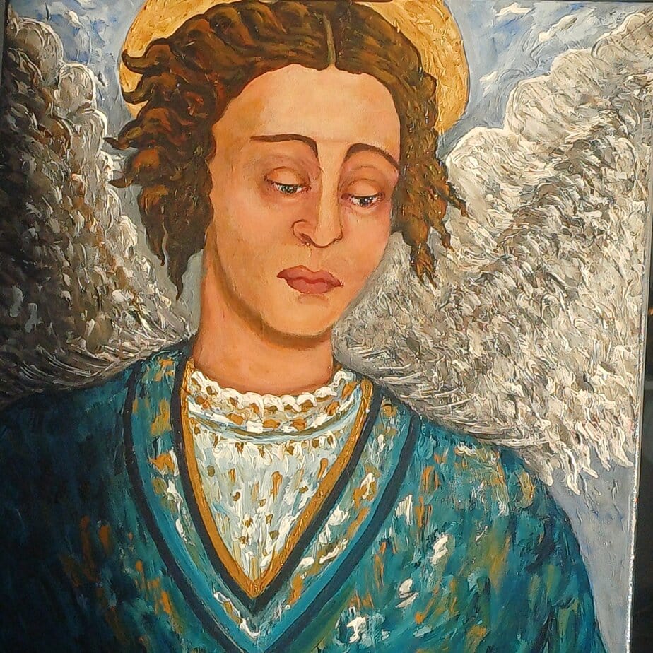 Η μορφή ενός Αγγέλου που μοιάζει να ισορροπεί ανάμεσα στον βυζαντινό μυστικισμό και τον σύγχρονο εξπρεσιονισμό έργο της
