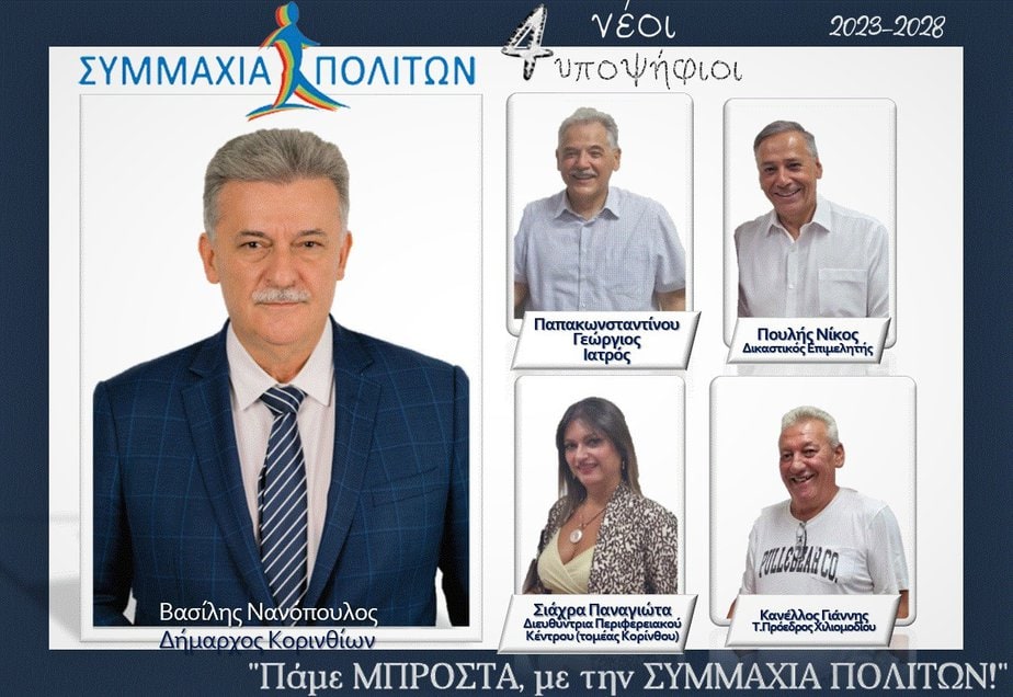 4 ακόμα υποψηφίους ανακοινώνει σήμερα η ΣΥΜΜΑΧΙΑ ΠΟΛΙΤΩΝ. Στις εκλογές του Οκτωβρίου η παράταξη του δημάρχου Κορινθίων κάνει πράξη την απαίτηση της κοινωνίας για ανανέωση. Ανανέωση σε πρόσωπα και πρακτικές όπως πολλές φορές έχει πει ο Βασίλης Νανόπουλος. Ο δήμος Κορινθίων του μέλλοντος απαιτεί ανθρώπους με σύγχρονη φιλοσοφία και με ανοιχτούς ορίζοντες. Σε συνδυασμό με την υπάρχουσα έμπειρη ομάδα και με τη καθοδήγηση του Δημάρχου που στα 4 πρώτα χρόνια, σε δύσκολες συνθήκες, απέδειξε την ικανότητα του στην διοίκηση με την επίλυση χρόνιων ζητημάτων αλλά και την αποτελεσματικότητα του με εισροή χρηματοδοτήσεων που ξεπέρασαν τα 150 εκ ευρώ , η νέα ΣΥΜΜΑΧΙΑ ΠΟΛΙΤΩΝ καλείται να οδηγήσει με ασφάλεια το δήμο Κορινθίων στα επόμενα χρόνια, και θα το κάνει!