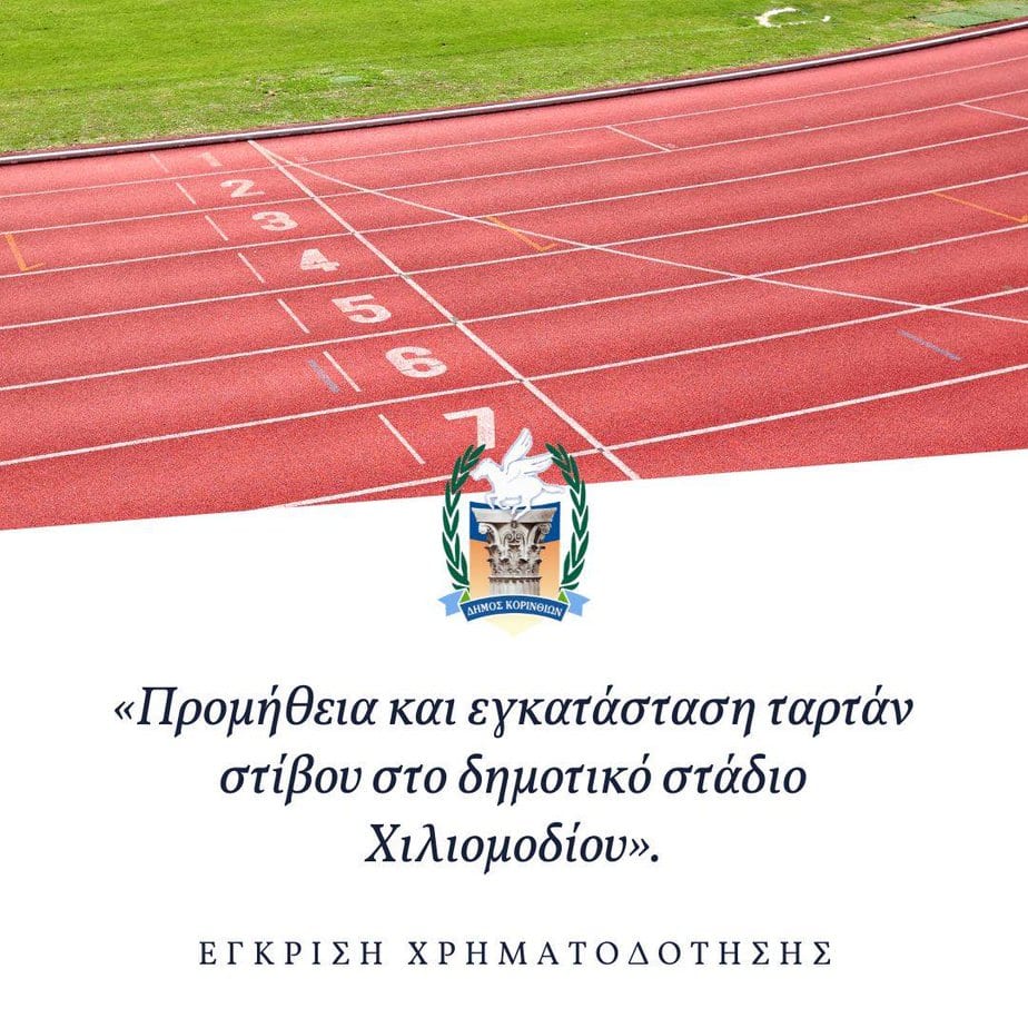 Νέα έγκριση με τίτλο πράξης «Προμήθεια και εγκατάσταση ταρτάν στίβου στο δημοτικό στάδιο Χιλιομοδίου», προϋπολογισμού 478.020,00€ και δικαιούχο τον Δήμο Κορινθίων στο πλαίσιο της Πρόσκλησης IV «Κατασκευή, επισκευή και συντήρηση αθλητικών εγκαταστάσεων των Δήμων» του Προγράμματος ΦΙΛΟΔΗΜΟΣ ΙΙ του ΥΠ.ΕΣ