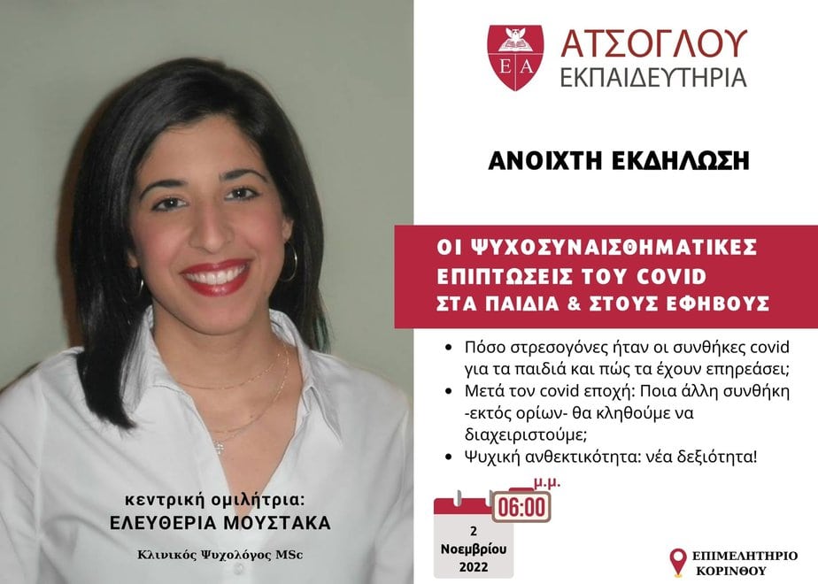 Μια ανοιχτή εκδήλωση-συζήτηση διοργανώνουν τα Εκπαιδευτήρια Ατσόγλου στο Επιμελητήριο Κορίνθου την Τετάρτη 2 Νοεμβρίου στις 6 μ.μ.