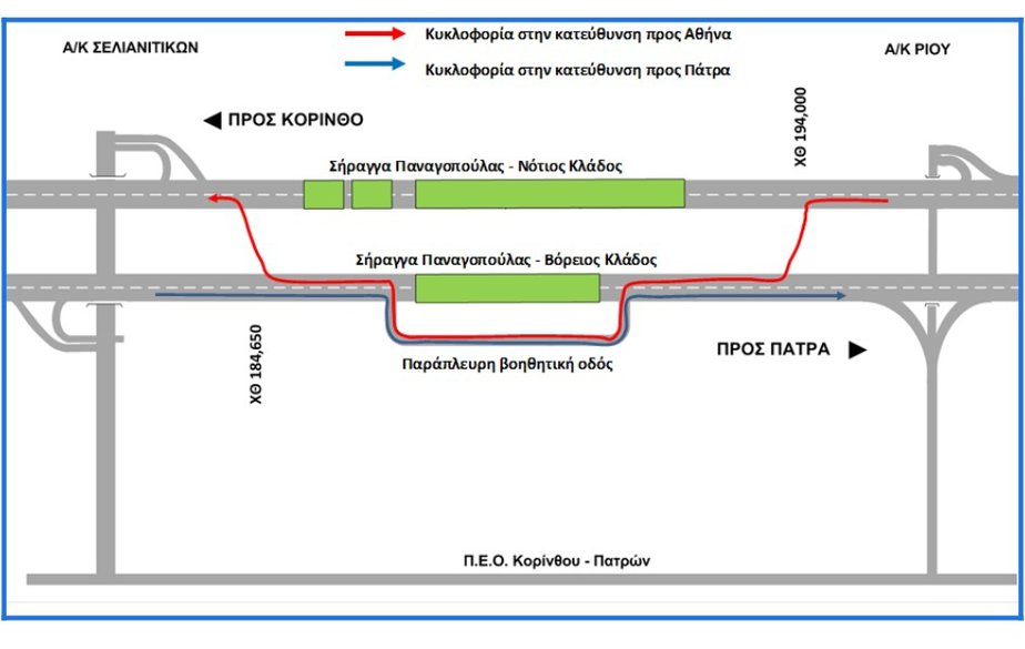 Ολιγόωρες κυκλοφοριακές ρυθμίσεις θα εφαρμοστούν την Τετάρτη 17/7 και την Πέμπτη 18/7 από τις 18:00 το απόγευμα έως τις 08:00 το πρωί της επόμενης ημέρας, στην περιοχή σηράγγων Παναγοπούλας του τμήματος Κορίνθου-Πατρών (μεταξύ των Χ.Θ. 184,650 και 194,000), προκειμένου να εκτελεστούν προγραμματισμένες δοκιμές και έλεγχοι του εξοπλισμού των σηράγγων. Συγκεκριμένα, τα δύο ρεύματα κυκλοφορίας θα εκτραπούν εκτός των σηράγγων στην παράπλευρη βοηθητική οδό της βόρειας σήραγγας, όπως φαίνεται στο ακόλουθο διάγραμμα.