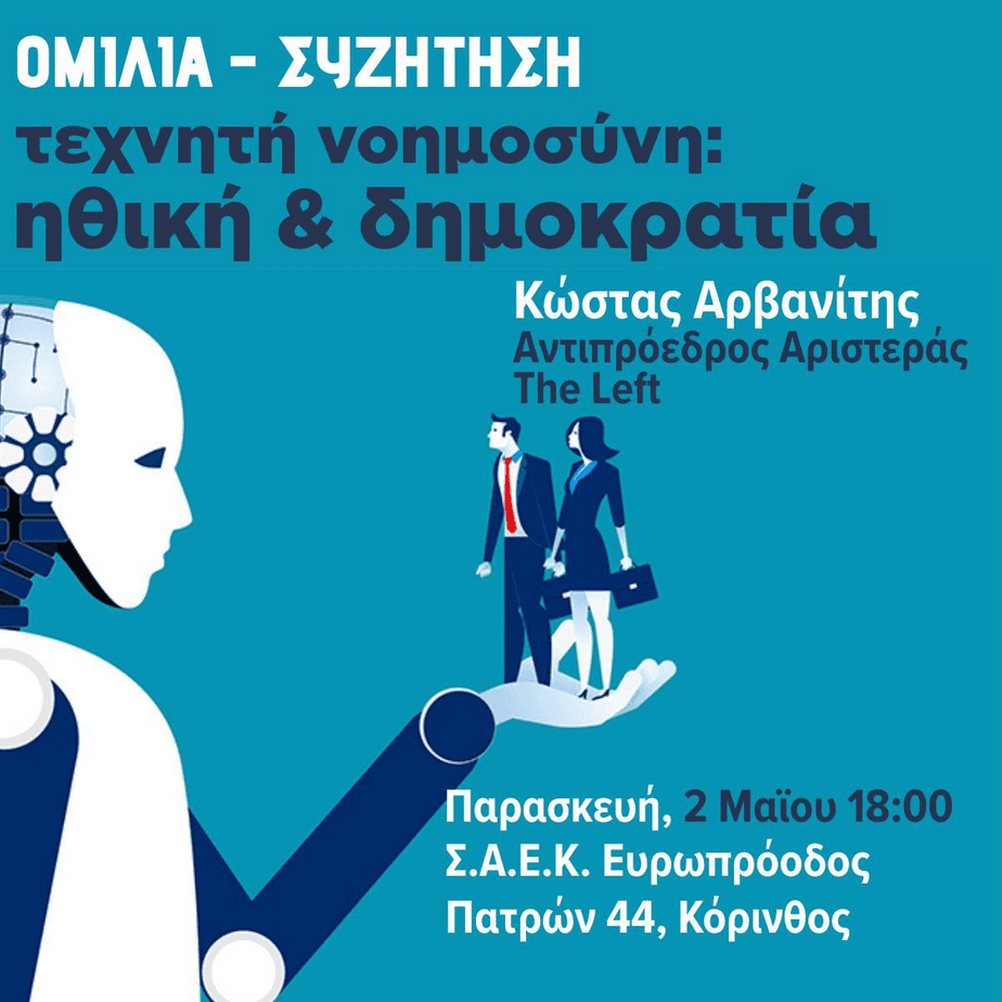 Την Παρασκευή 2 Μαΐου στις 18:00, στον χώρο της Σ.Α.Ε.Κ. Ευρωπρόοδος (Πατρών 44, Κόρινθος), θα πραγματοποιηθεί εκδήλωση με θέμα την τεχνητή νοημοσύνη και τις επιπτώσεις της στην ηθική και τη δημοκρατία.