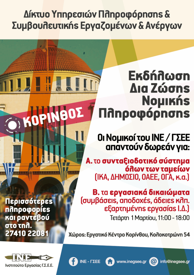 Η εκδήλωση, δια ζώσης πληροφόρησης με την παροχή δωρεάν υπηρεσιών νομικής πληροφόρησης ,θα πραγματοποιηθεί στο Εργατικό Κέντρο Κορίνθου την και ώρες Τετάρτη 1 Μαρτίου 2023 11:00 έως 18:00 .