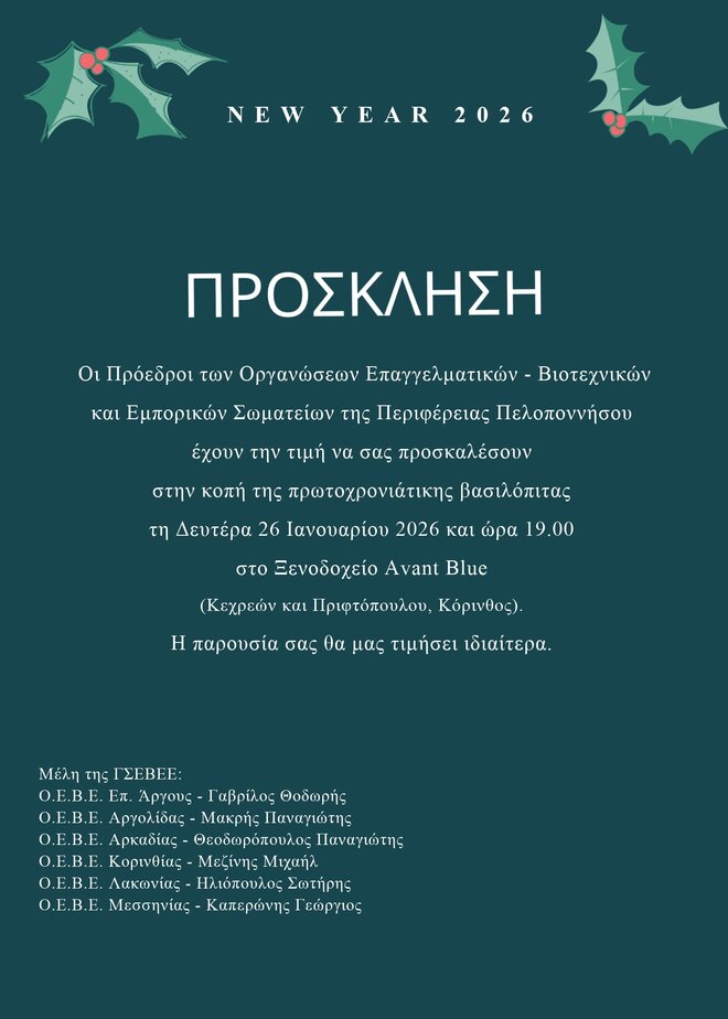 Οι Πρόεδροι των Οργανώσεων Επαγγελματικών – Βιοτεχνικών και Εμπορικών Σωματείων της Περιφέρειας Πελοποννήσου έχουν την τιμή να σας προσκαλέσουν στην κοπή της πρωτοχρονιάτικης βασιλόπιτας τη Δευτέρα 26 Ιανουαρίου 2026 και ώρα 19.00 στο Ξενοδοχείο Avant Blue (Κεχρεών και Πριφτόπουλου, Κόρινθος). Η παρουσία σας θα μας τιμήσει ιδιαίτερα. Μέλη της ΓΣΕΒΕΕ: Ο.Ε.Β.Ε. Επ. Άργους – Γαβρίλος Θοδωρής Ο.Ε.Β.Ε. Αργολίδας – Μακρής Παναγιώτης Ο.Ε.Β.Ε. Αρκαδίας – Θεοδωρόπουλος Παναγιώτης Ο.Ε.Β.Ε. Κορινθίας – Μεζίνης Μιχαήλ Ο.Ε.Β.Ε. Λακωνίας – Ηλιόπουλος Σωτήρης Ο.Ε.Β.Ε. Μεσσηνίας – Καπερώνης Γεώργιος