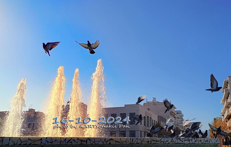 Τα περιστέρια ξεδιψούν, στο σιντριβάνι της Πλατείας Ελευθερίου Βενιζέλου της πόλης μας.