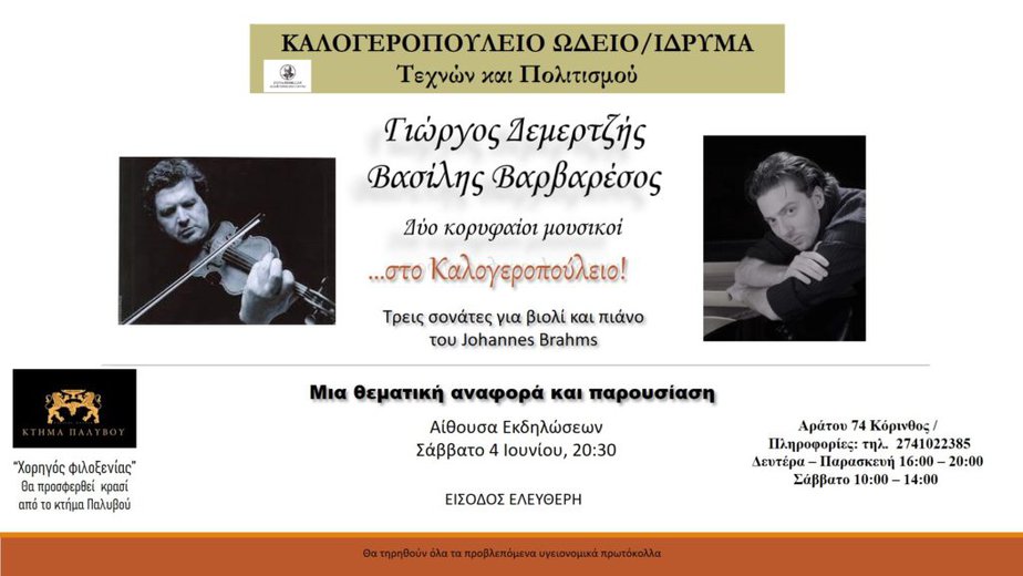 “Μια μεγάλη συναυλία από το Καλογεροπούλειο Ίδρυμα στην Κόρινθο, το Σάββατο 4 Ιουνίου στις 20.30 στην Αίθουσα εκδηλώσεων του Ιδρύματος, με ελεύθερη είσοδο. Το κοινό θα έχει τη δυνατότητα να απολαύσει δύο κορυφαίους σολίστ, τον Γιώργο Δεμερτζή στο βιολί και τον Βασίλη Βαρβαρέσο στο πιάνο. Η συναυλία περιλαμβάνει τρεις σονάτες για βιολί και πιάνο του Brahms. Το Καλογεροπούλειο βρίσκεται Αράτου 74 στην Κόρινθο. Πληροφορίες στο τηλ. 2741022385 Δευτέρα ως Παρασκευή 4 με 8 το απόγευμα και Σάββατο 10 με 2 το μεσημέρι. Χορηγός φιλοξενίας κτήμα Παλυβού.”