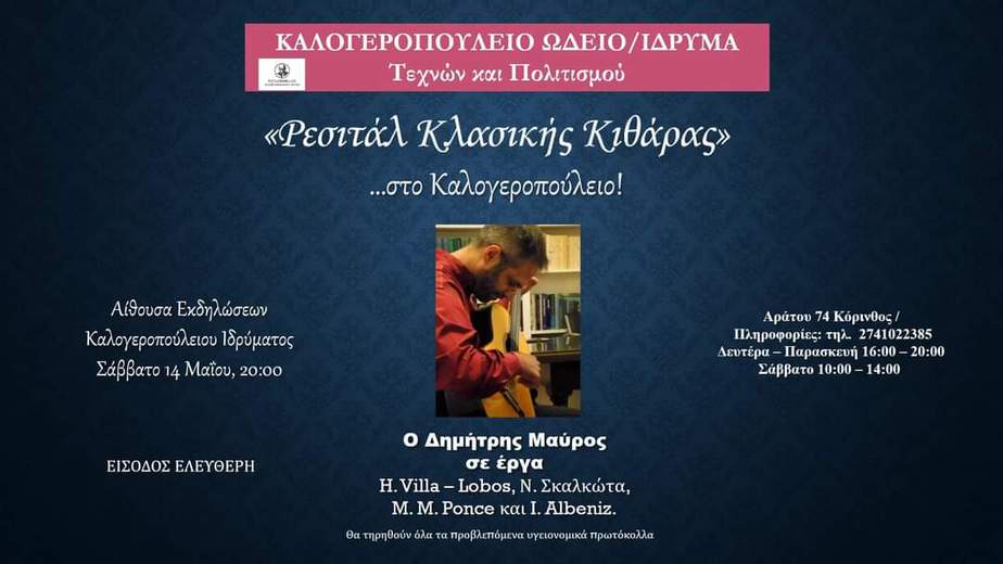 Αυτό το Σάββατο 14 Μαΐου στις 20:00 ο καθηγητής του Καλογεροπούλειου Δημήτρης Μαύρος θα εμφανιστεί ως σολίστ στο προσωπικό του κιθαριστικό ρεσιτάλ στην αίθουσα εκσηλώσεων του Ιδρύματος. Προσκαλεσμένοι όλοι ο οι σπουδαστές του Καλογεροπούλειου, αλλά και όλων των Ωδείων, όπως επίσης και κάθε ενδιαφερόμενος εραστής της μουσικής τέχνης.