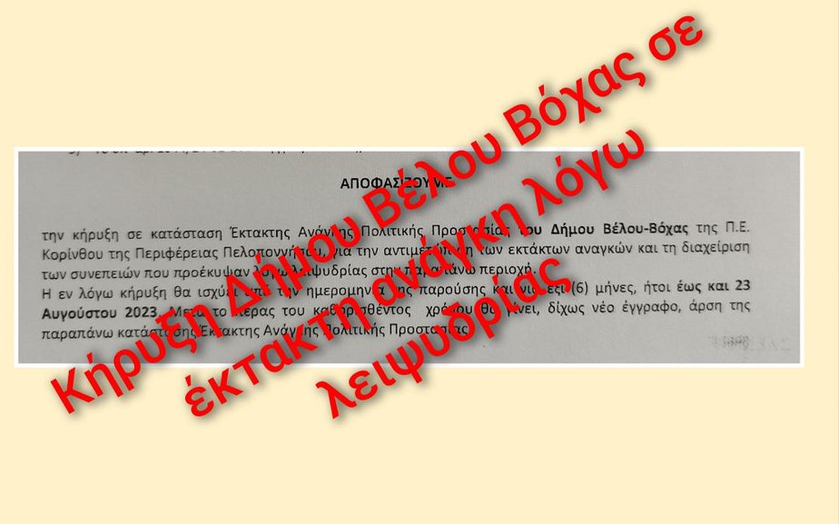 Μετά από αίτημα του δημάρχου Βέλου-Βόχας κ. Αννίβα Παπακυριάκου προς την Περιφέρεια Πελοποννήσου και την Γενική Γραμματεία Πολιτικής Προστασίας, αναγνωρίστηκε – επιτέλους – η δυσμενής, λόγω των καιρικών συνθηκών και της κλιματικής αλλαγής – κατάσταση στην οποία έχει περιέλθει όλος ο υδροφόρος ορίζοντας της περιοχής του δήμου Βέλου-Βόχας και έγινε δεκτή η κήρυξη σε έκτακτη ανάγκη.