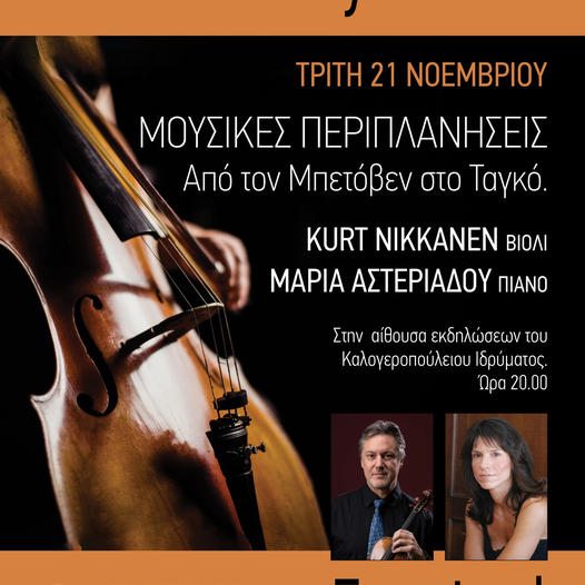Οι μουσικοί Kurt Nikkanen (βιολί) και Μαρία Αστεριάδου (πιάνο) ερχόμενοι από την Αμερική θα μας χαρίσουν μια αξέχαστη μουσική βραδιά την Τρίτη 21 Νοεμβρίου και ώρα 20.00 στην αίθουσα εκδηλώσεων του Καλογεροπούλειου Ιδρύματος.