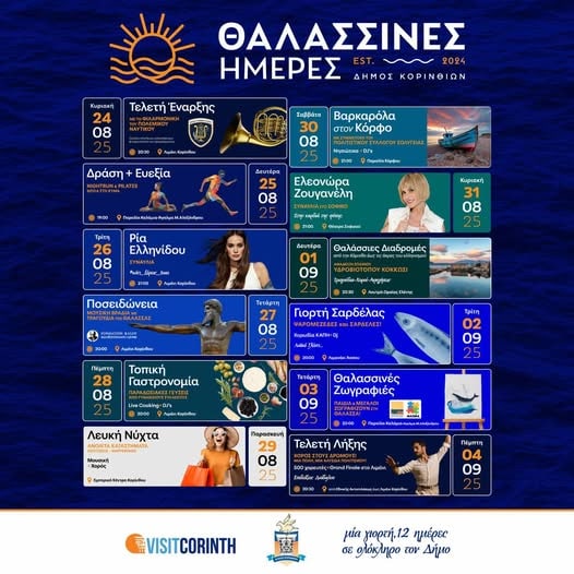 Από τις 24 Αυγούστου έως τις 4 Σεπτεμβρίου, η Κόρινθος ζει στους ρυθμούς της θάλασσας και του πολιτισμού με ένα πλούσιο φεστιβάλ γεμάτο μουσική, χορό, αθλητισμό, γαστρονομία και παραδόσεις.