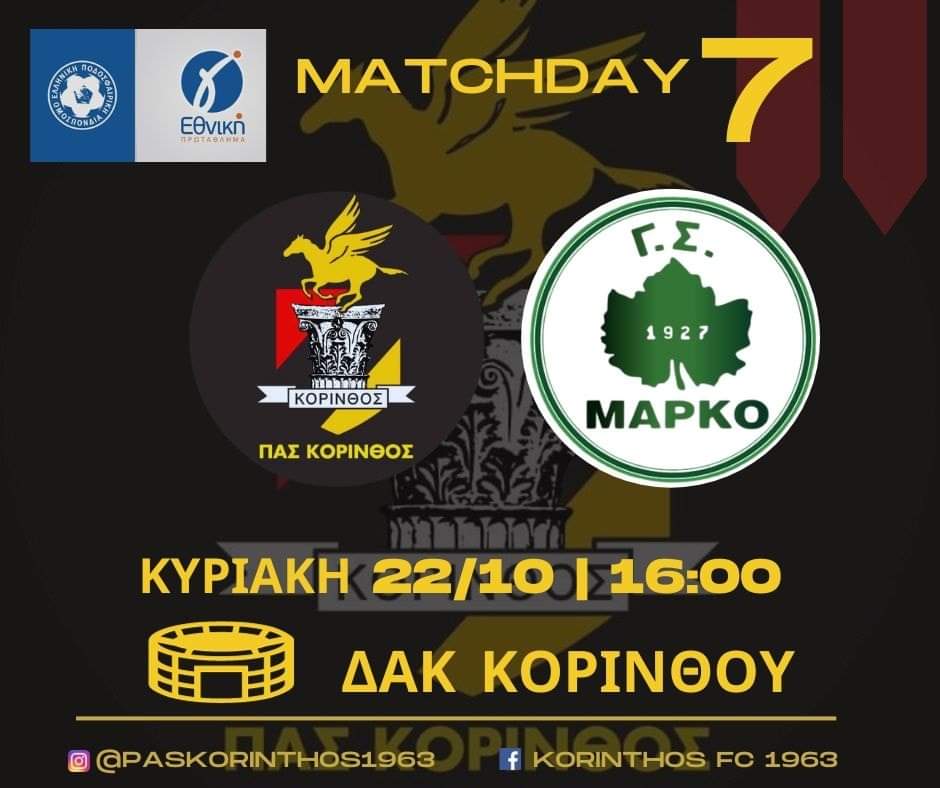 Ο ΠΑΣ Κόρινθος αντιμετωπίζει την Μαρκό στο ΔΑΚ Κορίνθου την Κυριακή 22/10.