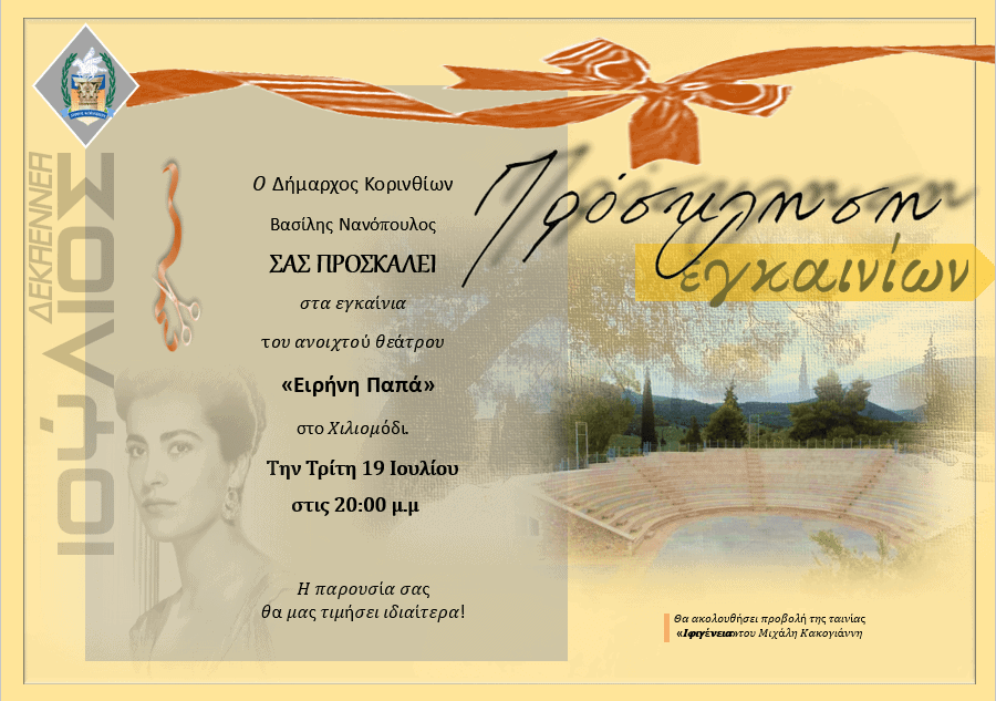 ΕπικαιρότηταΚεντρική ΣελίδαΤοπικά Νέα Την Τρίτη 19 Ιουλίου τα εγκαίνια του νέου θεάτρου της Κορίνθου “Ειρήνη Παππά” 17/07/2022 0 FacebookTwitterPinterestWhatsAppEmailViber Ο Δήμαρχος Κορινθίων Βασίλης Νανόπουλος ΣΑΣ ΠΡΟΣΚΑΛΕΙ στα εγκαίνια του ανοιχτού θεάτρου «Ειρήνη Παπά» στο Χιλιομόδι Την Τρίτη 19 Ιουλίου στις 20:00 μ.μ Η παρουσία σας. θα μας τιμήσει ιδιαίτερα! ΜΟΙΡΑΣΟΥ ΤΟ ΑΡΘΡΟ: Click to share on X (Opens in new window) X Click to share on Facebook (Opens in new window) Facebook Click to email a link to a friend (Opens in new window) Email Click to share on WhatsApp (Opens in new window) WhatsApp Click to print (Opens in new window) Print Click to share on LinkedIn (Opens in new window) LinkedIn Ξεκινά τη λειτουργία του το θέατρο Ειρήνη Παππά στο Δήμο ΚορινθίωνDate18/07/2022In relation toΚεντρική ΣελίδαΕγκαίνια του Εποχικού Πυροσβεστικού Κλιμακίου ΣοφικούDate13/07/2020In relation toΚεντρική ΣελίδαΤο Εθνικό Θέατρο με τον «Ιππόλυτο» του Ευριπίδη στο Θέατρο Χιλιομοδίου «Ειρήνη Παπά» αυτό το ΣάββατοDate28/07/2023In relation toΚεντρική Σελίδα