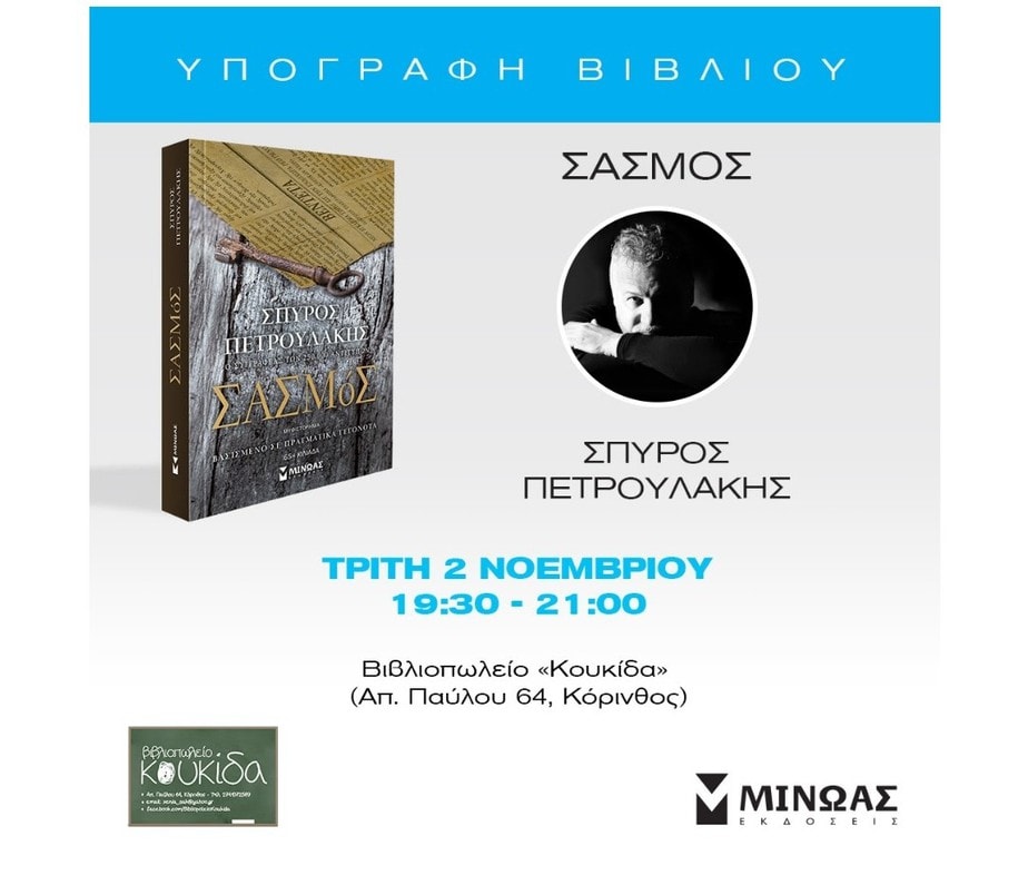 Την Τρίτη 2 Νοεμβρίου και ώρα 7:30 – 9:00 μ.μ., θα βρίσκεται στο βιβλιοπωλείο μας ο συγγραφέας του βιβλίου “ΣΑΣΜΟΣ” Σπύρος Πετρουλάκης για υπογραφή βιβλίων και για να συζητήσει μαζί σας, από τις εκδόσεις Μίνωας.