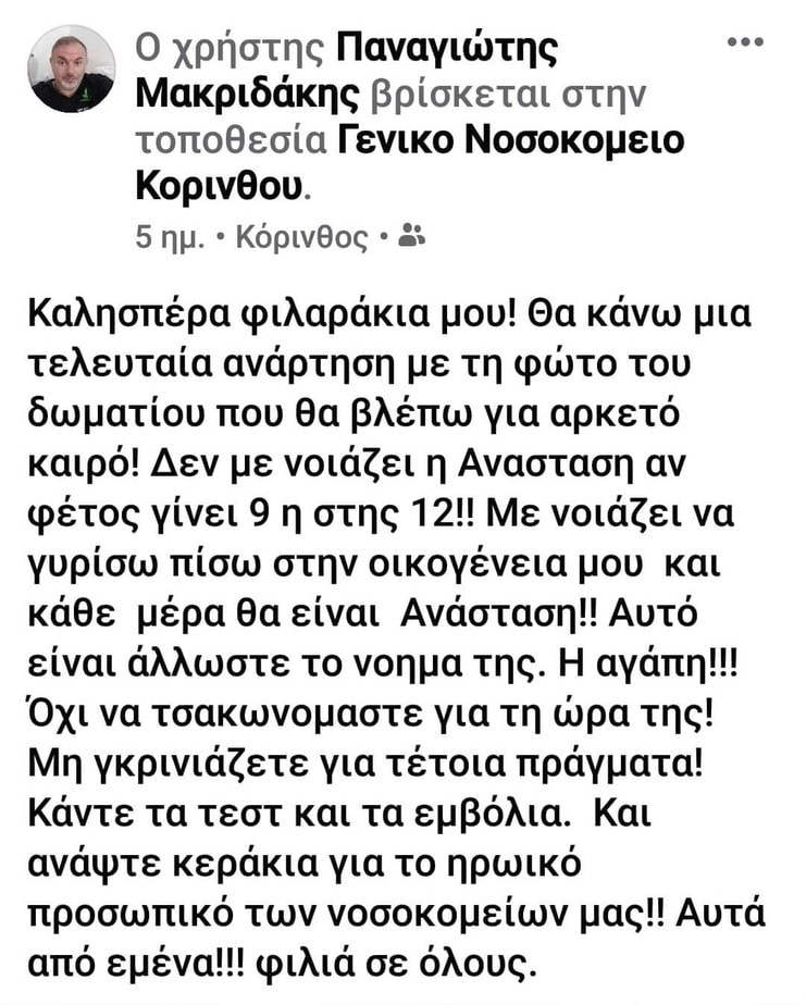” Δεν με νοιάζει η Ανασταση αν φέτος γίνει 9 η στης 12!! Με νοιάζει να γυρίσω πίσω στην οικογένεια μου και κάθε μέρα θα είναι Ανάσταση!! Αυτό είναι άλλωστε το νοημα της. Η αγάπη!!! Όχι να τσακωνομαστε για τη ώρα της! Μη γκρινιάζετε για τέτοια πράγματα! Κάντε τα τεστ και τα εμβόλια. Και ανάψτε κεράκια για το ηρωικό προσωπικό των νοσοκομείων μας!! Αυτά από εμένα!!! φιλιά σε όλους.”