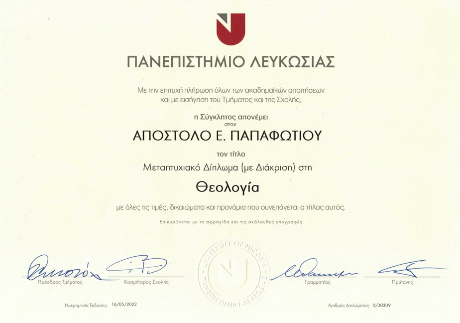 Συμμετέχοντας στη μεγάλη προσπάθεια της Μητροπόλεως Κορίνθου για τη δημιουργία Κέντρου Μαθήσεως στη Σχολή Θεολογίας, του Πανεπιστημίου Λευκωσίας, σε Μεταπτυχιακό επίπεδο και με κατεύθυνση τις Παύλειες Σπουδές παρακολούθησα και αποφοίτησα από το αντίστοιχο πρόγραμμα διάρκειας δύο ετών. Έδρα των μαθημάτων του Κέντρου θα ήταν το Συνεδριακό Κέντρο των Αγίων Αναργύρων της Μητροπόλεως στην Αρχαία Κόρινθο, όπου εκεί είχε προγραμματισθεί να γίνονται τα μαθήματα , μαζί με ένα πλούσιο πρόγραμμα διαλέξεων και μεγάλων συνεδρίων.