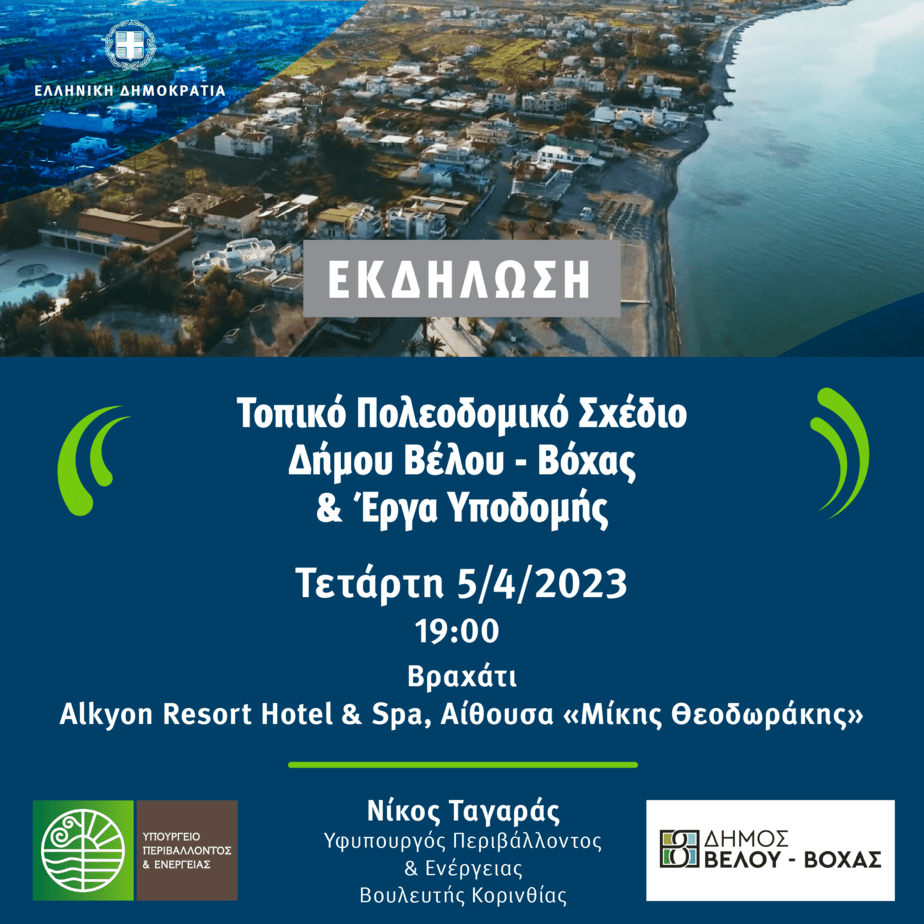 Εκδήλωση με θέμα «Τοπικό Πολεοδομικό Σχέδιο Δήμου Βέλου – Βόχας και Έργα Υποδομής», που θα πραγματοποιηθεί την