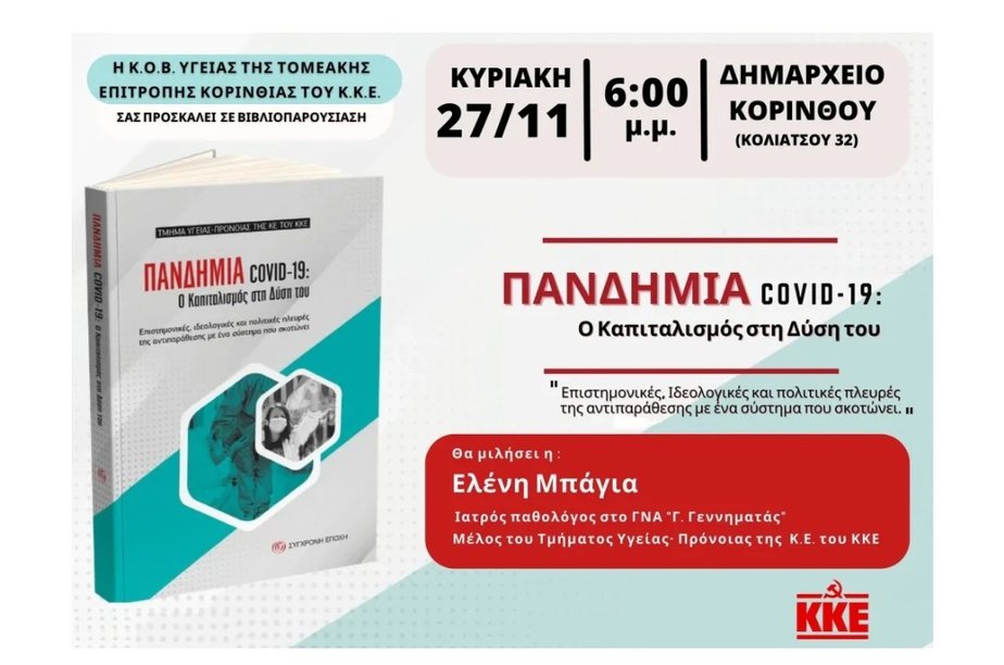Η Κ.Ο.Β. Υγείας της Τομεακής Επιτροπής Κορινθίας του ΚΚΕ σας καλεί σε βιβλιοπαρουσίαση του βιβλίου «Πανδημία Covid-19: Ο Καπιταλισμός στη δύση του«